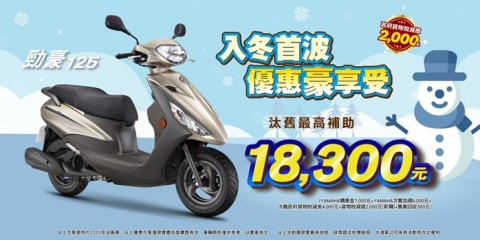 新年換車不猶豫!勁豪高CP首選! 新國民車勁豪125優惠最高18,300元 購車汰舊換新最高優惠 18,300元 (YAMAHA購車金7,000元+YAMAHA汰舊加碼5,000元+汰舊政府貨物稅減免4,000元+貨物稅減徵2,000元+舊車回收300元=18,300)  勁 豪 125 詳情:...