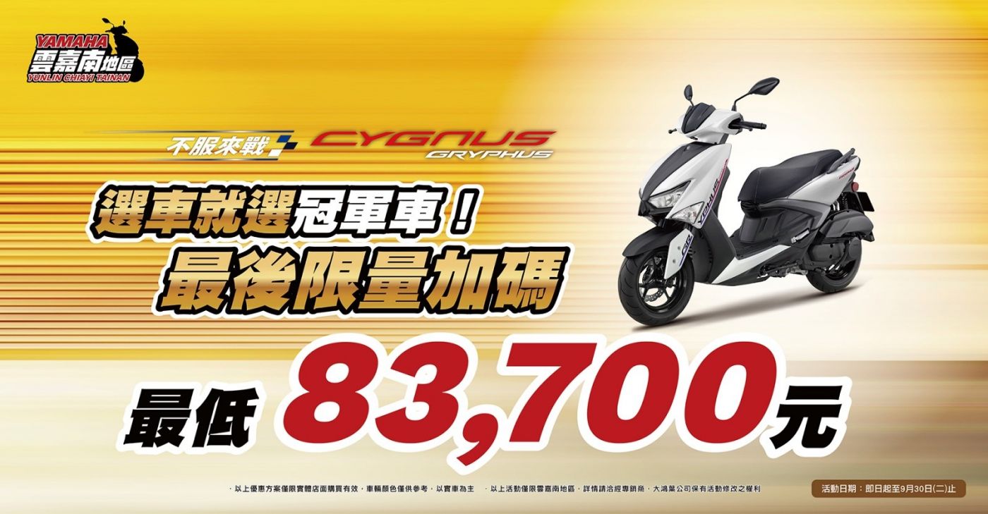 以上活動僅限雲嘉南地區的實體店面購買有效,車輛顏色僅供參考,以實車為主