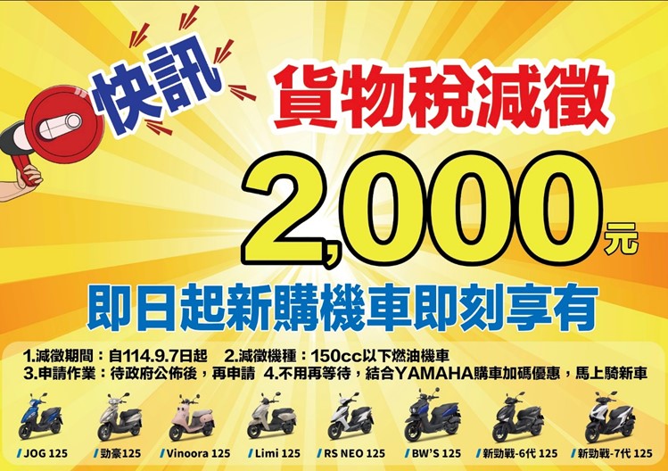 即日起購買150cc以下機車每輛最高減徵2千元,