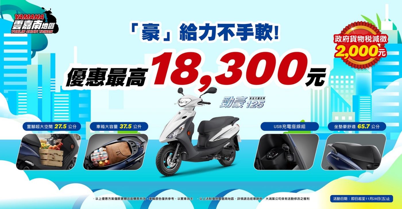 (YAMAHA購車金7,000元+YAMAHA汰舊加碼5,000元+政府貨物稅減免4,000元+貨物稅減徵2,000元+舊車回收300元=18,300)